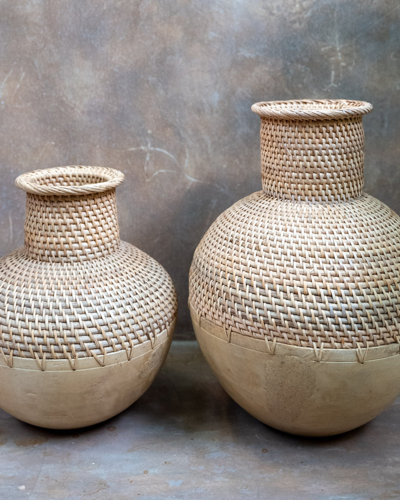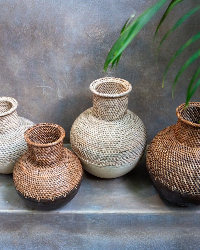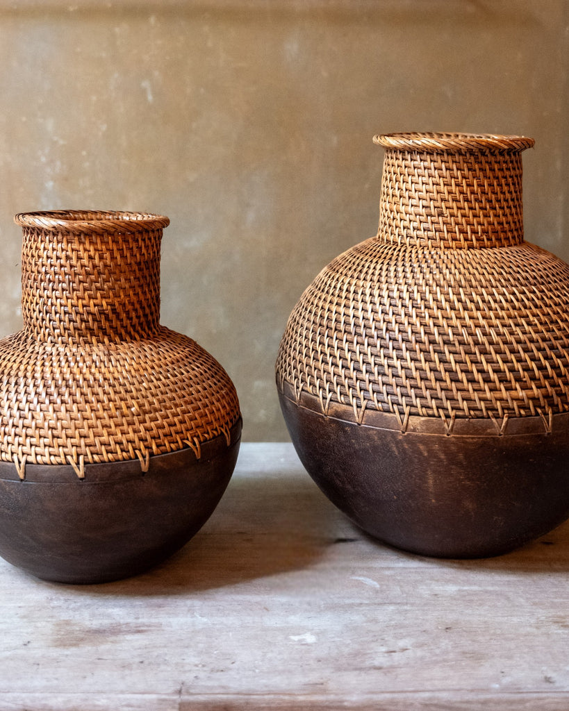 One of our personal favourite collections, the Burleigh Decorative Vase brings together hand sculpted solid wood with a tight rattan weave similar to the Talise collection and finished in a signature "gelintir" weave where the rattan wraps around itself and is interlaced with the bottom layers. Available in different sizes and finishes.