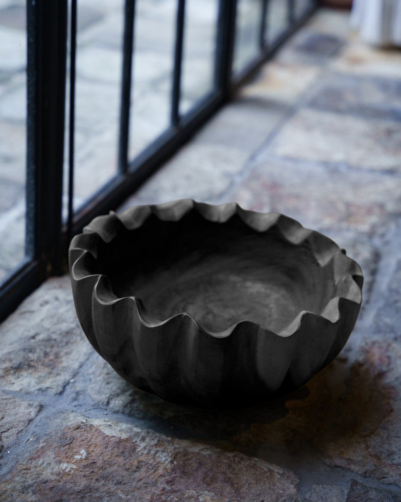 Made from Suar wood with an elegant scallop pattern, each bowl is carefully hand-carved by expert artisans in Indonesia. Every item is one of a kind, ideal as a centrepiece for decoration or as a functional bowl for fruit and more.